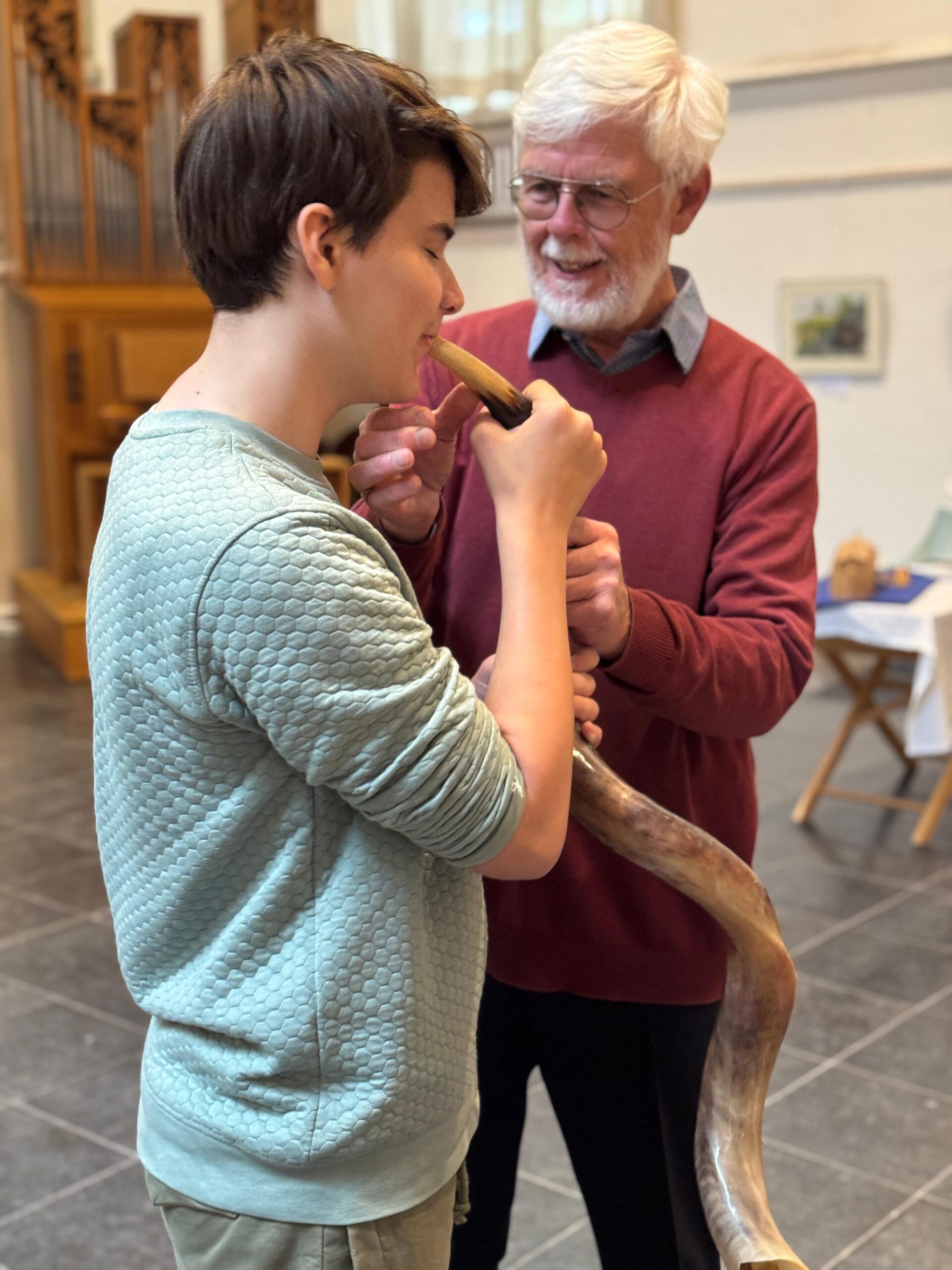 De leerlingen mochten proberen om geluid uit een dierenhoorn te krijgen. Dit was lastiger dan gedacht, maar een aantal leerlingen kreeg het toch voor elkaar!