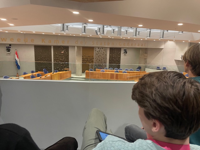 In het tijdelijk parlementsgebouw kwamen we gelukkig allemaal zonder problemen door de beveiliging. Al snel vingen we een glimp op van enkele bekende bewindslieden. De dag eindigde op de publieke tribune van de plenaire zaal van de Tweede Kamer, waar de leerlingen alle vragen aan onze enthousiaste gids konden stellen die ze tijdens de dag hadden verzameld.